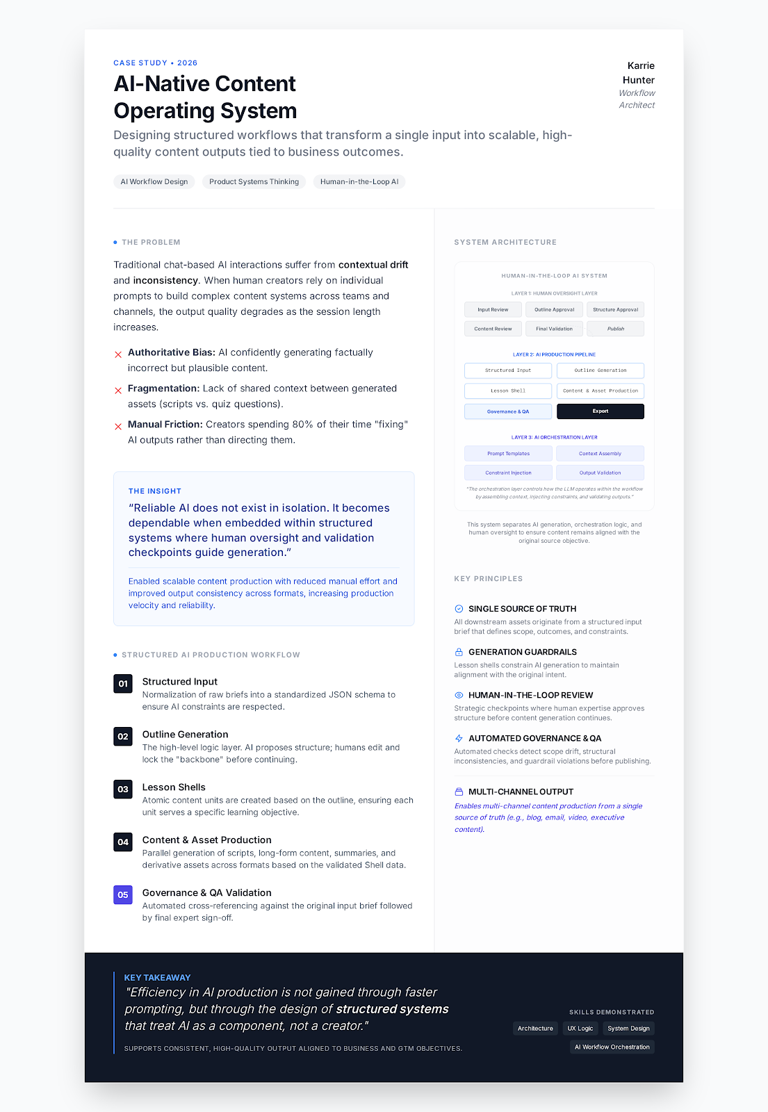 I design AI-native systems that transform how organizations produce content at scale. This example shows how a single structured input can generate consistent, high-quality outputs across formats using workflow design, guardrails, and human validation. The goal is not faster prompting, but reliable, scalable production tied to business outcomes.